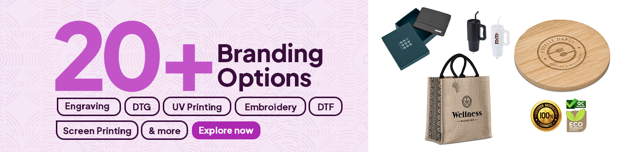 Our branding options include Screen printing, Digital Custom Packaging, Debossing, Digital Printing on Bags, Digital Printing on Drinkware, Digital Printing on Notebooks, Digital Transfer Printing on Apparel & Caps, Direct to Product Printing, Domed Stickers, Embroidery, Hot Foil Stamping, Heat Transfer, Laser Engraving, Pad Printing, Silicone Transfer, Sublimation on Mugs, Sublimation on Lanyards, Vinyl Stickers, UV Sticker and more